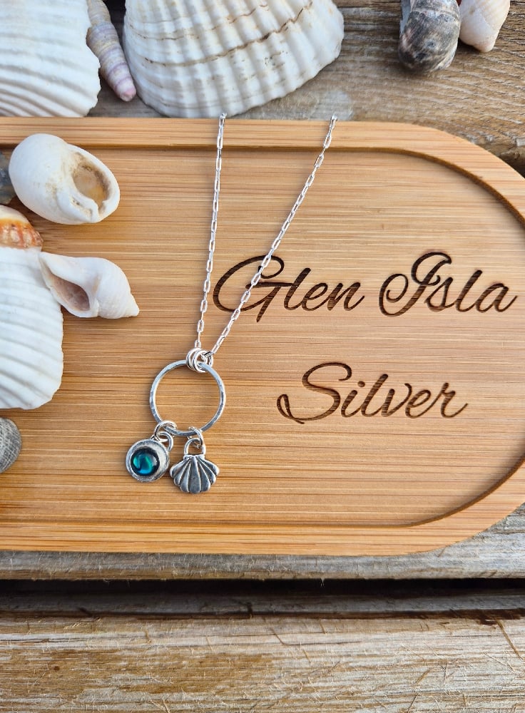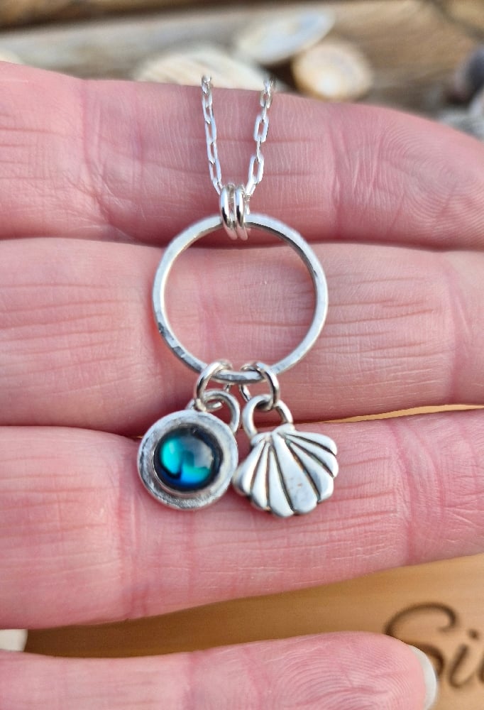 A chunky little shell charm and a blue abalone cabochon gemstone charm hanging from a hammered ring on an 18" sterling silver chain. Charms are handcrafted from recycled sterling silver.