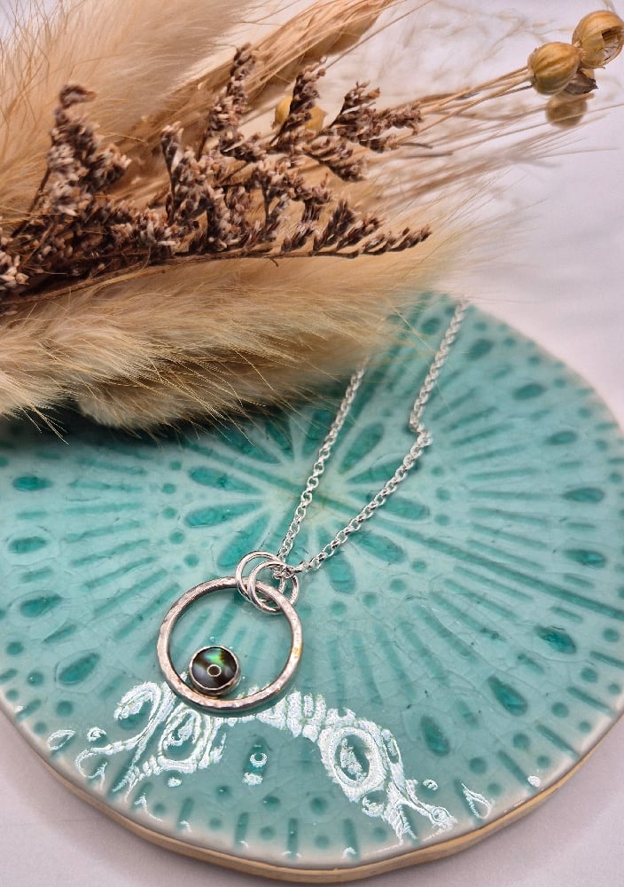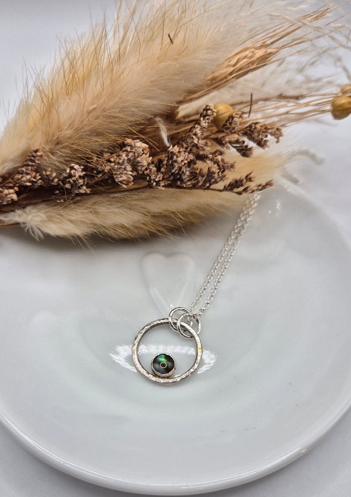 Blue abalone cabochon gemstone set in a handcrafted recycled sterling silver hammered ring, hung on an 18" recycled sterling silver chain.