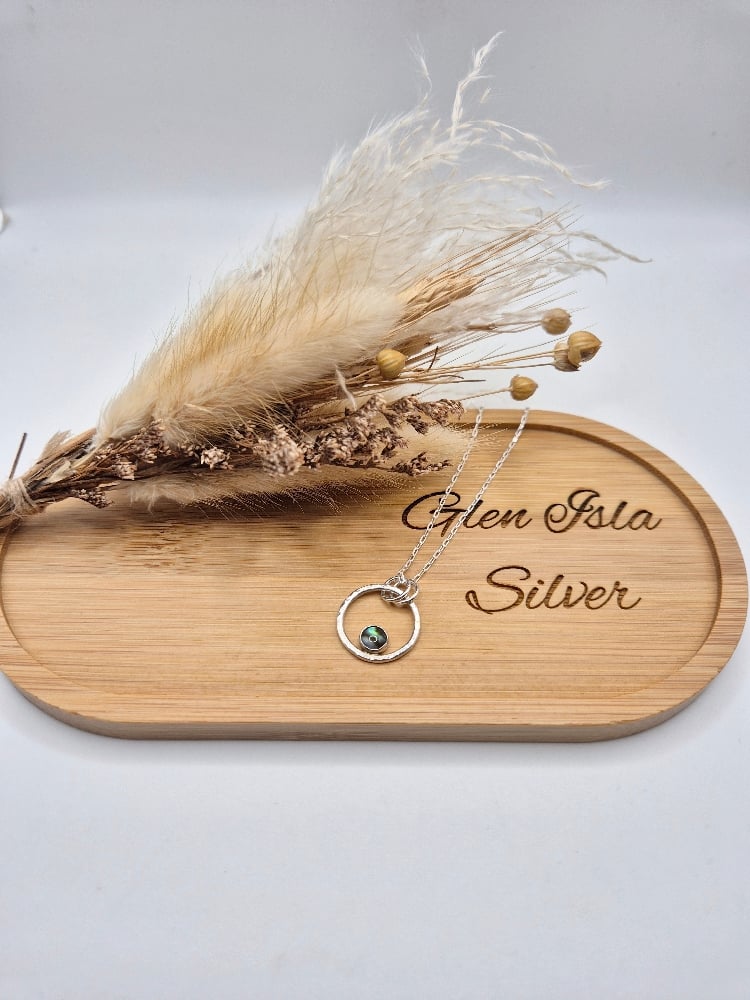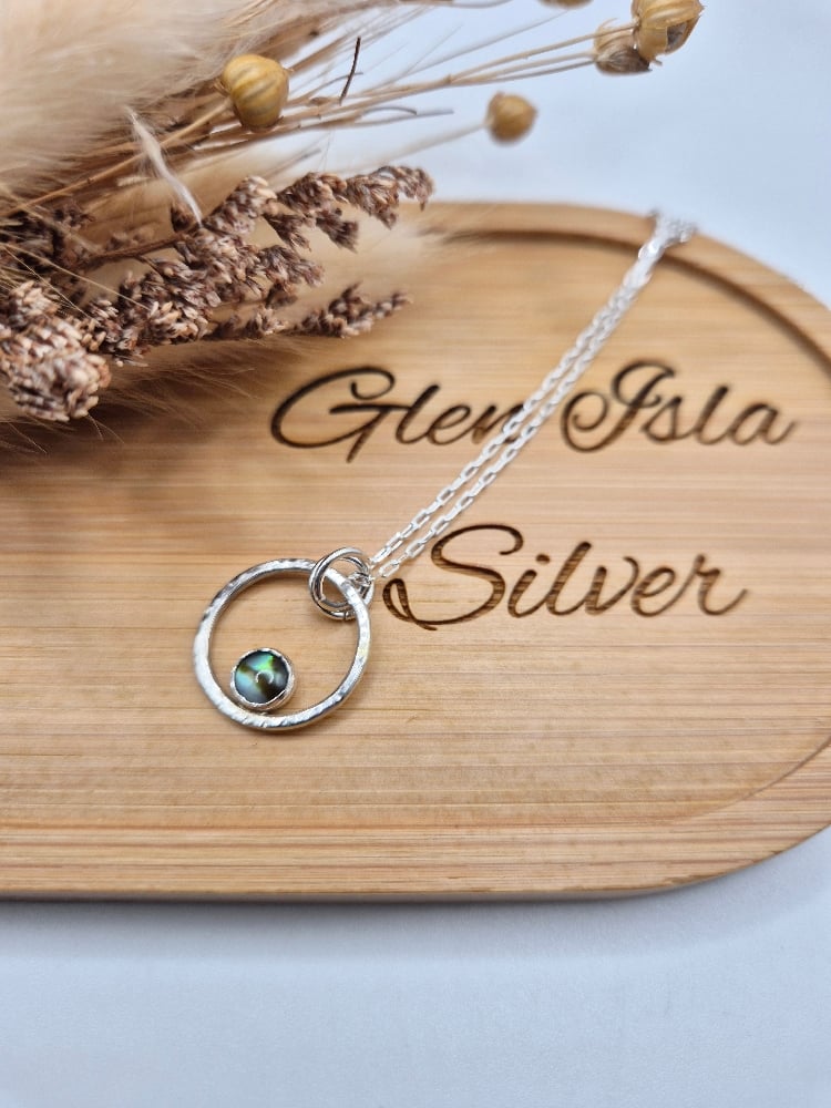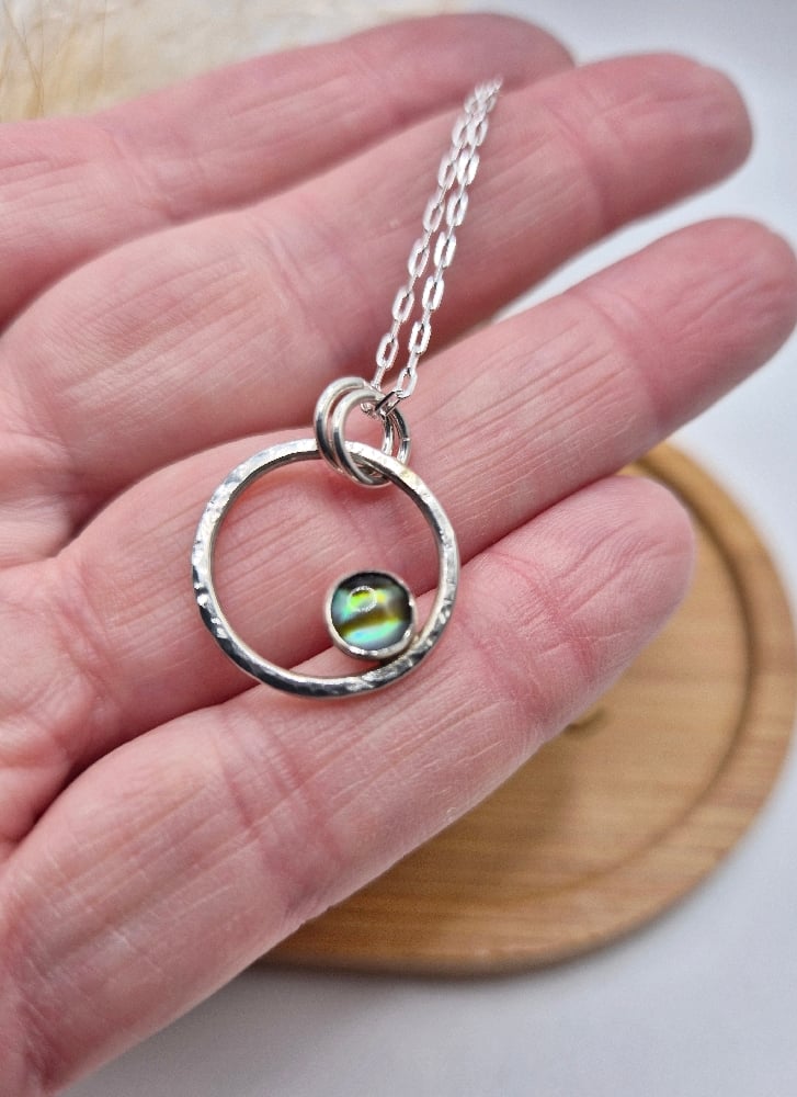 Blue abalone cabochon gemstone set in a handcrafted recycled sterling silver hammered ring, hung on an 18" sterling silver chain.