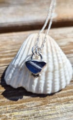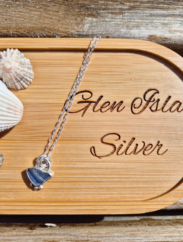 Blue seaglass from the East Neuk of Fife, bezel set in recycled sterling silver, on an 18" sterling silver chain.