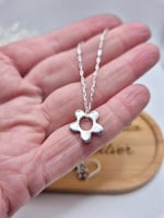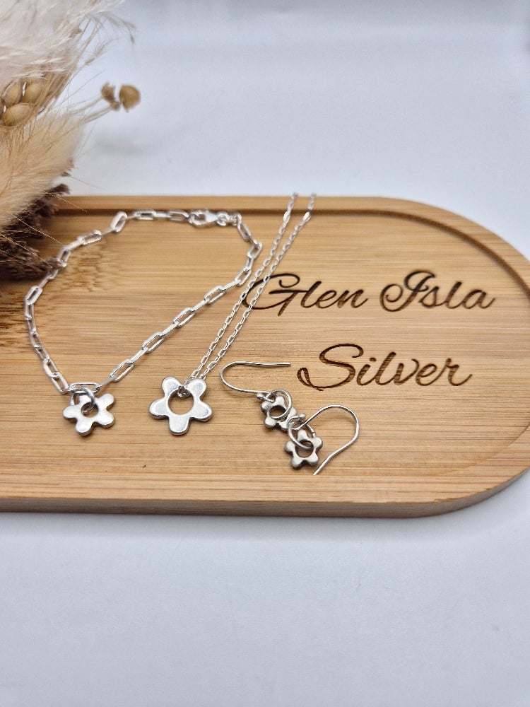 Handcrafted recycled sterling silver daisy on a sterling silver 18" chain, sterling silver hook earrings or sterling silver paperclip style bracelet (7.5" in length).