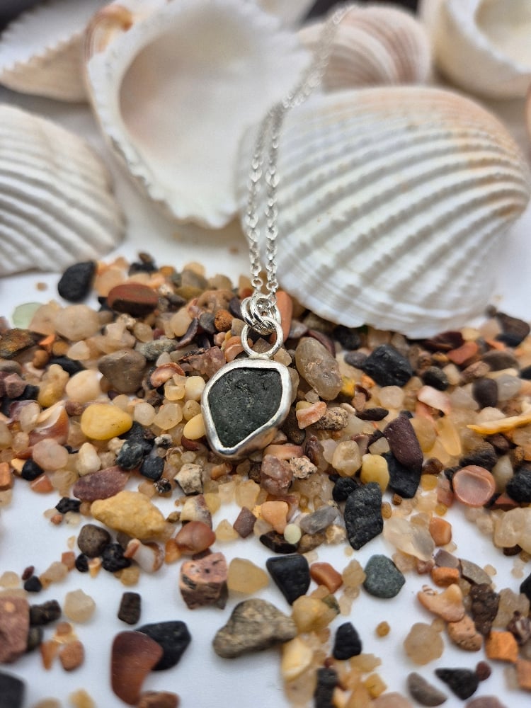 Dark green North Berwick seaglass set in a recycled sterling silver bezel, on an 18" sterling silver chain.