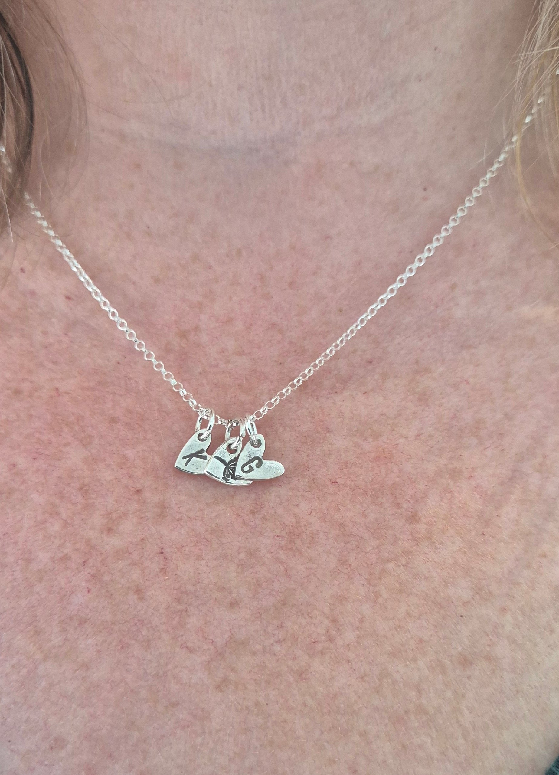 Handcrafted heart charms created using eco conscious recyled sterling silver on an 18" recycled sterling silver chain, with a choice of one, two or three handstamped hearts. This item is handcrafted to order, please allow a few days for the creation process!
