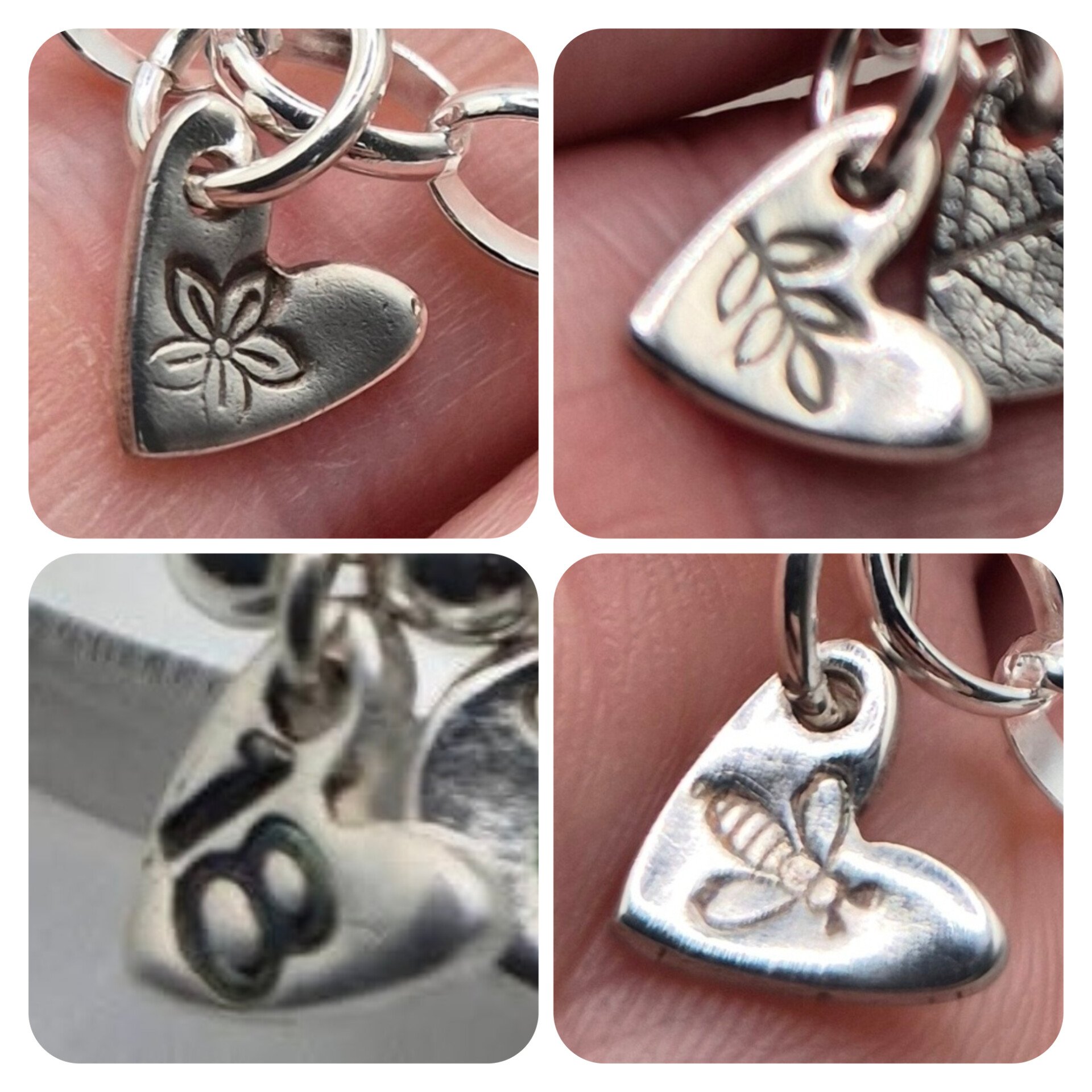 Choose up to three handstamped heart charms with letter initials, numbers or a choice of: