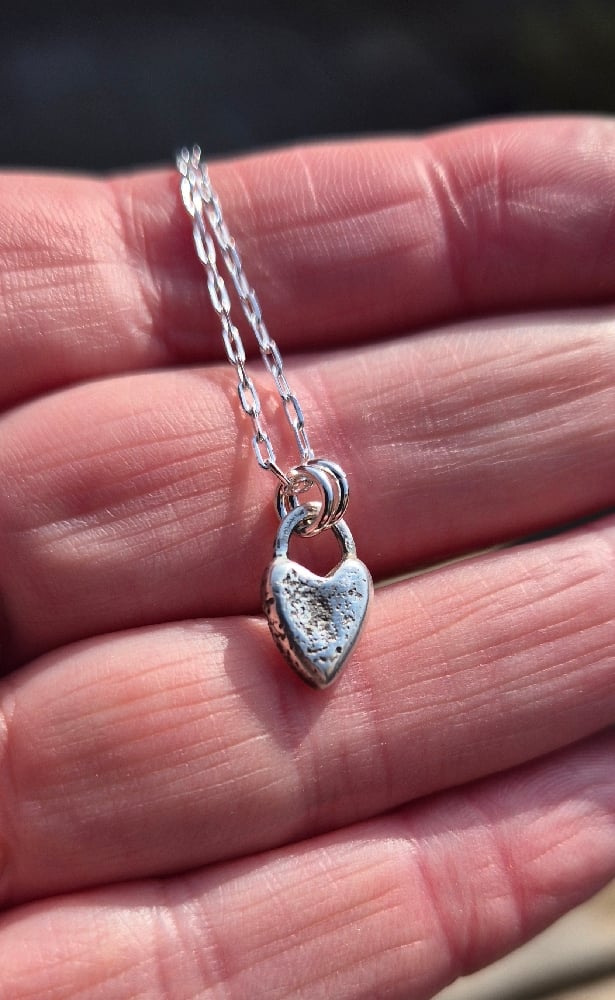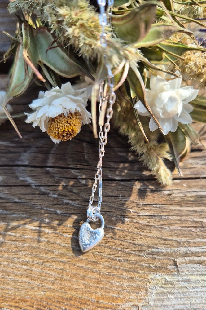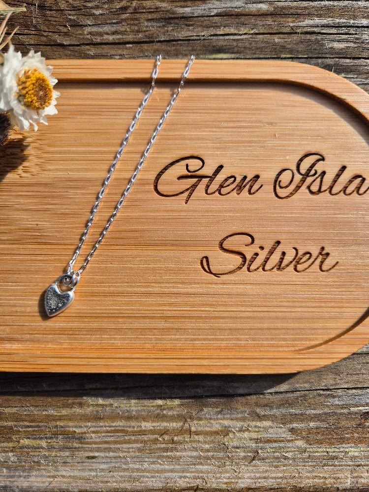 A solid chunky heart handcrafted from recycled sterling silver with grains of sand from the beautiful East Neuk of Fife used to create a sandy surface. It comes on an 18" sterling silver chain.