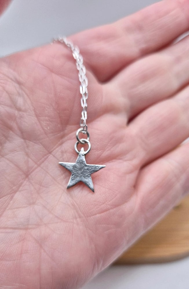 Handcrafted recycled sterling silver star on an 18" sterling silver chain, a 7.5" sterling silver paperclip style chain bracelet and sterling silver hook earrings. A fine, lightweight star with a lightly hammered finish.