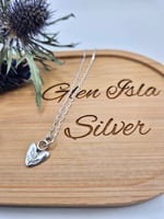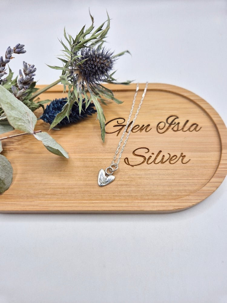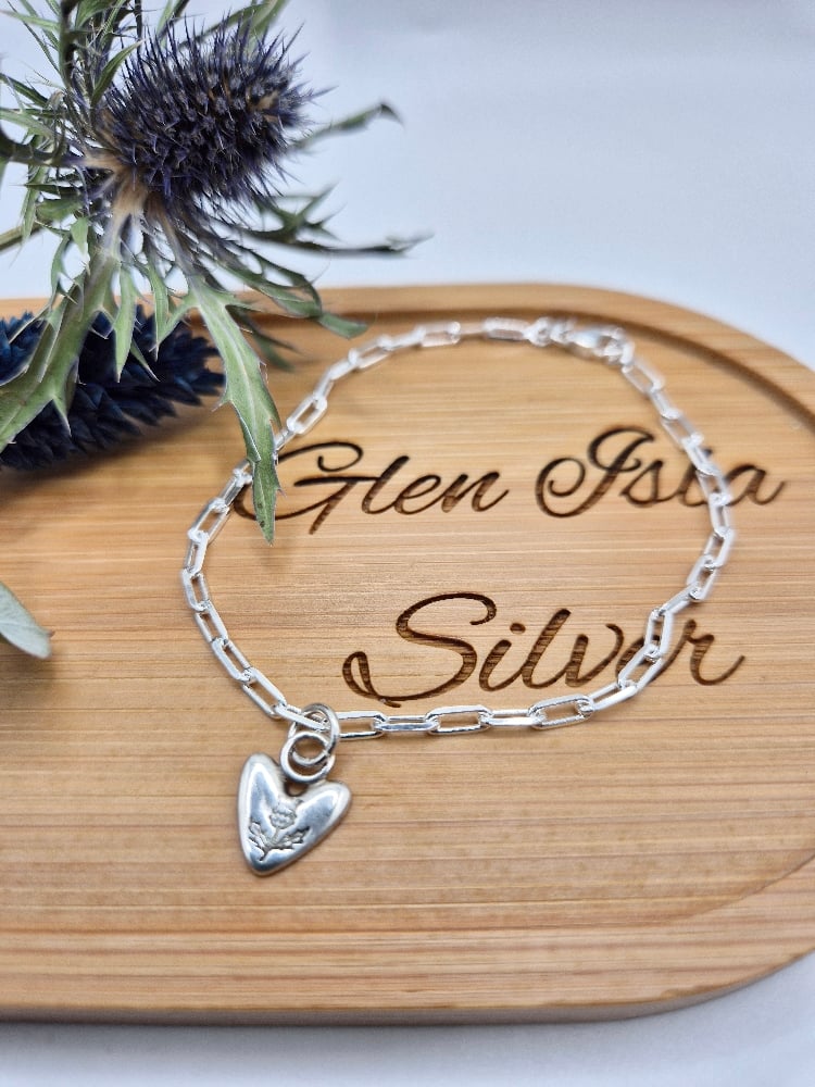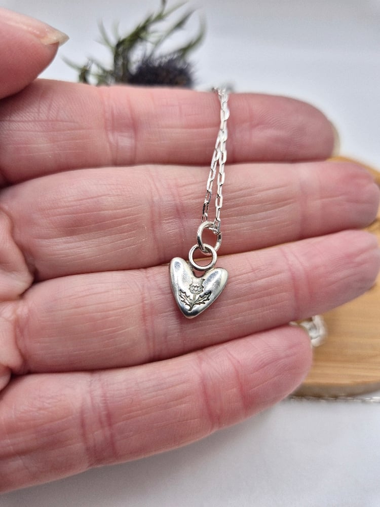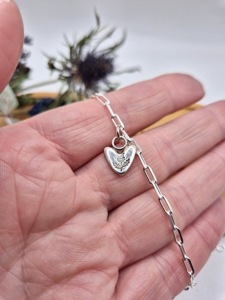 A heart handcrafted from recycled sterling silver and handstamped with a tiny thistle on an 18" sterling silver chain or 7.5" paperclip chain style bracelet.