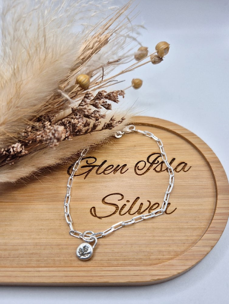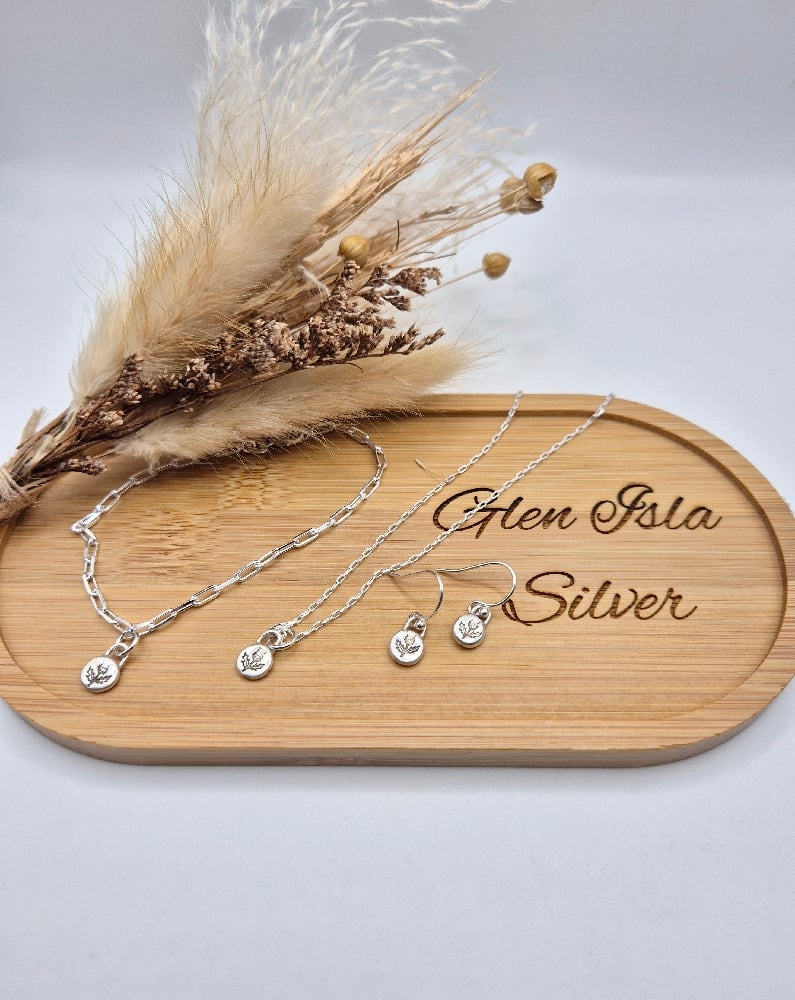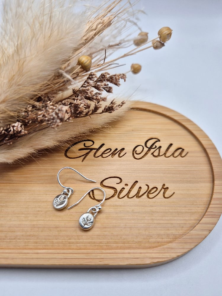 A tiny thistle stamped pebble, handcrafted from recycled sterling silver on an 18" or 22" sterling silver chain, 7.5" sterling silver bracelet or hook earrings.